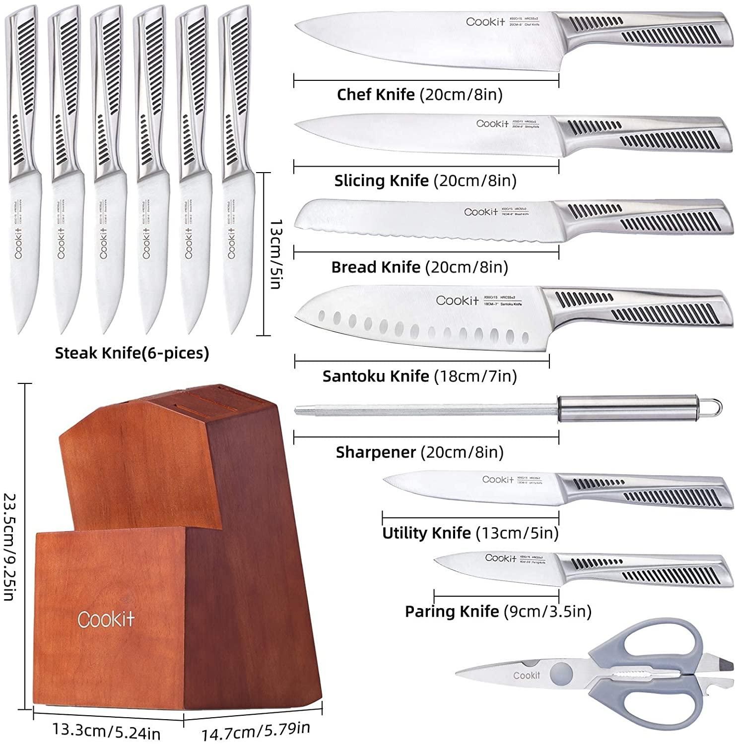 Kitchen Knife Set; Cookit 15 Piece Knife Sets with Block Chef Knife Stainless Steel Hollow Handle Cutlery with Manual Sharpener - default