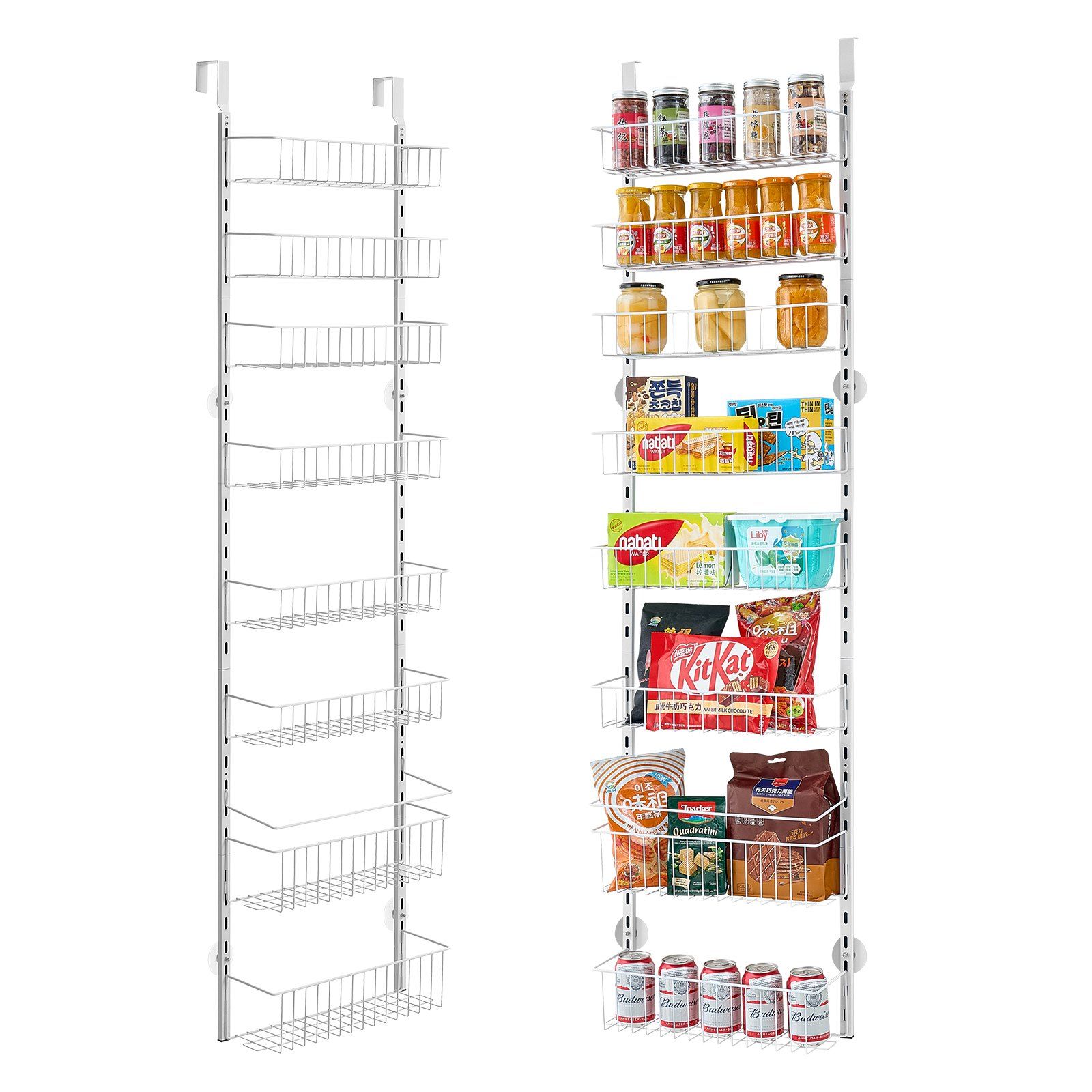 · Adjustable & Easy to Install: This pantry organization and storage rack features adjustable basket spacing to accommodate items of different heights. You can hang it on the door or use the included screws to mount it on the wall, with assembly completed in just a few minutes
